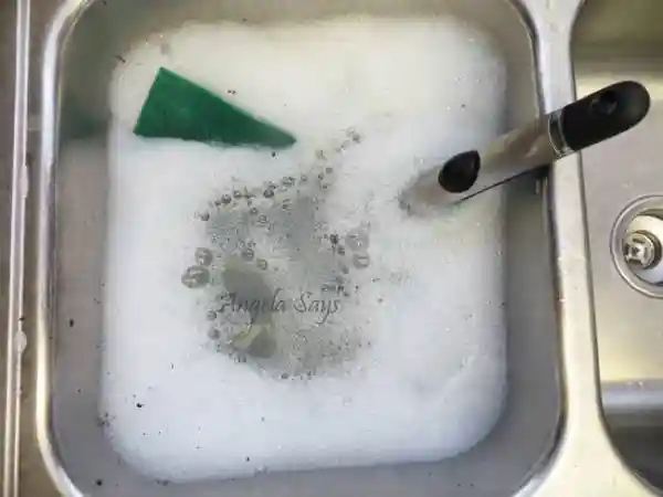 At this point 99% of the grease will come right off, a few spots will need a some encouragement from a scrubby. All of the little black flecks in the sink are pieces of grease that came right off.