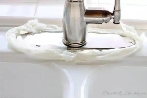 Domestically Speaking uses one of my favorite cleaning agents, white vinegar, to remove stubborn hard water stains from around the faucet.